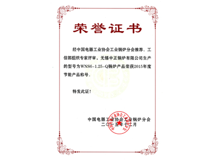 2015年11月, WNS6-1.25-Q型燃氣冷凝蒸汽鍋爐榮獲工信部評選的"節(jié)能產品"